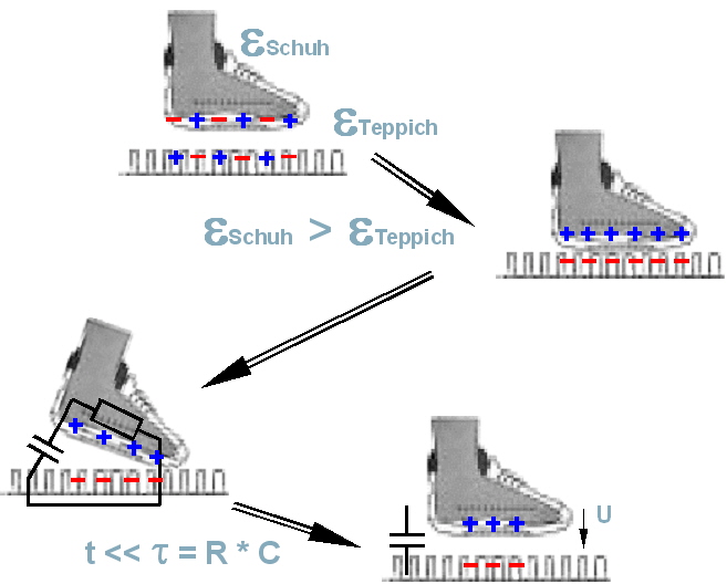 Nach dem Kontakt der beiden Materialien und dem Ausgleich der Fermi-Niveaus, erfolgt die Trennung der Materialien. Der Erhalt der Ladung hängt von der Leitfähigkeit der Körper ab. Entscheidend ist dabei sowohl die Oberflächen- als auch die Volumenleitfähigkeit. Bei dem Trennvorgang kommt es zu einer letzten gemeinsamen Kontaktfläche. Die Grenzschichten der beiden Materialien stellen während der Trennung einen Kondensator dar. Mit Hilfe von t = R * C kann die Zeit abgeschätzt werden, bei der noch Restladungen bestehen bleiben. Wenn die Geschwindigkeit der Trennung sehr viel höher als t ist, bleibt nach dem Trennvorgang eine Restladung bestehen. Eine Erhöhung der Entfernung erhöht dann die Potentialdifferenz. Es können so einige kV an Spannung entstehen. Wird der Abstand der beiden Materialien soweit erhöht, das eine Spannung über 30kV/cm entsteht, erfolgt eine Entladung über die Luft.